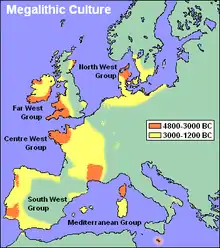 The location of Perdigões, in Reguengos de Monsaraz, is thought to have been an important location. Twenty small ivory statues dating to 4,500 years BP have been discovered there since 2011. It has constructions dating back to about 5,500 years. It has a necropolis. Outside the location there is a cromlech.[15] The Almendres Cromlech site, in Évora, has megaliths from the late 6th to the early 3rd millennium BC.[16] The Anta Grande do Zambujeiro, also in Évora, is dated between the early 4th and the mid 3rd millennium BC.[17][18] The Dolmen of Cunha Baixa, in Mangualde Municipality, is dated between 3000 and 2500 BC.[19] The Cave of Salemas was used as a burial ground during the Neolithic.[8]