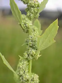 Evidence of agriculture is found in all Central Plains complexes. Archaeological sites in Nebraska reveal cultivated crops such as little barley (Hordeum pusillum), sunflowers (Helianthus annuus), goosefoot (Chenopodium berlandieri), marsh elder (Iva annua), and maize (Zea mays).[3] Tribes periodically switched from farming to hunting throughout their history during the Plains Village period,[4] AD 950–1850.