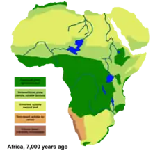 Herders from the Central Sahara migrated southward toward areas more fit for pastoralism, as the Green Sahara became increasingly dry after 3500 BCE.[67] Seasonal waterways were the likely migratory route taken, by hunter-gatherers and cattle herders, to the Niger River and Chad Basin.[17] Dwelling in the Sahelian region began to occur as long inhabited settlement and funerary sites of the northern region of Niger stopped being used.[17] Migration of Central Saharan peoples into the Sahelian region of Sub-Saharan Africa is verified via Saharan influenced pottery that appear in the Sahelian region.[17] Herders from the Sahara expanded, along with their cord-wrapped, roulette-detailed ceramic culture and the agricultural practice of pearl millet, throughout West Africa.[68] Saharan roulette-detailed ceramics may be associated with herding cultures from southern Algeria or pre-herding cultures from Niger.[68] After the first half of the 3rd millennium BCE, tamed pearl millet emerged for the first time near the Saharan and Sahelian regional boundary, thereafter, it expanded into the Sahelian and West Sudanian savanna regional boundary of Sub-Saharan Africa.[68] In adaptation to desertification, Saharan herders developed agriculture as an additional subsistence strategy.[68] As an adaptation to the desertification of the Sahara amid the Green Sahara period, Saharan herders may have begun increasingly utilizing untamed flora near seasonally developed and local water sources (e.g., streams, ponds), and thus, contributed to the increased utilization and agricultural spread of pearl millet.[68] After 2500 BCE, desertification of the Green Sahara may have resulted in Saharan herders traversing further south in West Africa.[68] Amid the 2nd millennium BCE, agriculture, likely along with cord-wrapped, roulette-detailed ceramics, spread throughout the Sahelian and West Sudanian savanna regions of West Africa.[68] Cultural experience with the desertification of the Green Sahara may have contributed to adept adjustment to the drying of the Sahelian and West Sudanian savanna regions of Sub-Saharan Africa by agropastoralists.[68] Agropastoralists, as early agriculturalists, who likely originated in the Central Sahara, began to migrate southward into these regions around 2200 BCE.[68] Agropastoralists traversed through Tilemsi Valley and Ounjougou.[69] Additional adaptations to desertification of the southern Sahara may have been the development of transhumance, which was engaged in seasonally among some agricultural herders, and the increased development of cord-wrapped roulette-detailed ceramics in Sub-Saharan Africa, which likely was first developed in the early period of the Holocene in the Central Sahara.[68] While also hunting and gathering, agropastoralists engaged in agriculture on a seasonal basis.[50] Earlier subsistence strategies involved a combined approach (e.g., agriculture, pastoralism, hunting, foraging).[50] Later, migratory herding, which is solely reliant on pastoralism, developed, and divergence between modern migratory herders and settled agriculturalists occurred.[50] After 1400 BCE and before 800 BCE the spread of agriculture may have been altered, and greening of the western Sahel occurred amid 2nd millennium BCE.[68] Spread of tamed pearl millet may reached Lake Chad, via eastern spread from the Niger River or an alternative avenue from the Central Sahara.[68] Increased dryness began to recur after 800 BCE in West Africa and Central Africa.[68] Amid 1st millennium BCE, agriculture spread, not only near Lake Chad, but near the Niger Delta, Senegal Valley, Jos Plateau, and the southern region of Cameroon.[68]