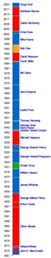 This article only covers the time since the Canadian Confederation was created in 1867. For the premiers of Canada West from 1840 to 1867, see List of joint premiers of the Province of Canada.