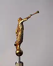 The white granite exterior and zinc roof have caused it to be described as reminiscent of England's old churches.[8] The angel Moroni statue atop the spire is known as, "one of the landmarks of the M61".[9] The temple has four ordinance rooms and four sealing rooms, and is the largest Latter-day Saint temple in Europe, at 69,630 square feet (6,470 m2).[10] The older London England Temple is smaller, at 46,174 square feet (4,290 m2).[11]