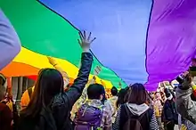 A pride parade (also known as pride march, pride event, or pride festival) is an outdoor event celebrating lesbian, gay, bisexual, and transgender (LGBT) social and self acceptance, achievements, legal rights, and pride. The events also at times serve as demonstrations for legal rights such as same-sex marriage. Most pride events occur annually, and some take place around June to commemorate the 1969 Stonewall riots in New York City, a pivotal moment in modern LGBTQ social movements.[4] The parades seek to create community and honor the history of the movement. In 1970, pride and protest marches were held in Chicago, Los Angeles, New York City, and San Francisco around the first anniversary of Stonewall. The events became annual and grew internationally.[5] In 2019, New York and the world celebrated the largest international Pride celebration in history: Stonewall 50 - WorldPride NYC 2019, produced by Heritage of Pride commemorating the 50th anniversary of the Stonewall Riots, with five million attending in Manhattan alone.[6]