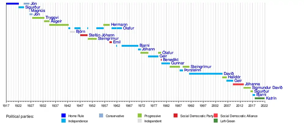 • | 7 April 2016 | 11 January 2017 | 280 | Progressive Party | PP–IP | Guðni Thorlacius Jóhannesson ![]() 1 August 2016– Independent | ||