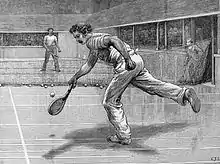 The "New Prince's Club", officially named the "Prince's Racquet and Tennis Club", was a socially exclusive club and sports centre for the upper ten. It opened in 1888 in Knightsbridge in the former Humphreys' Hall mansions which had been extensively reconstructed after a fire in May 1885.[5][lower-alpha 4] The Prince's Club title had been obtained from the Prince brothers.[17] The official opening took place on 18 May 1889 and was performed by Albert Edward, the Prince of Wales who was received by Sir William Hart Dyke, the president of the club.[16] To mark the occasion an exhibition real tennis match was played between Alfred Lyttelton and Charles Saunders. The club had two rackets and two real tennis courts but no longer provided any outdoor sports facilities.[lower-alpha 5][2] The new club also had two bowling alleys and several baths, including a Turkish bath and a private bath for the Prince of Wales.[15][5] The University racket matches as well as the Public Schools Championships moved to the newly created Queen's Club which took over the role of premier rackets facility from the Prince's Club.[6][2] Prince's did introduce a rackets competition between officers of the Royal Navy and the Royal Marines which was played from 1919 onward.[18] Many real tennis championship challenges were played at Prince's, Pierre Etchebaster won the world championship here from Fred Covey in 1928, having failed to do so in 1927. Notable real tennis professionals at Prince's include Henry Johns from c. 1926 to 1935.