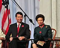She was elected Chancellor of the University of Edinburgh effective 31 March 2011, succeeding her father, who stepped down from the role in 2010.[91] Likewise, she accepted in 2011 the roles of president of City and Guilds of London Institute,[92] Master of the Corporation of Trinity House[93][94] and president of the Royal Society of Arts, also in succession to her father. Anne has been the president of the Commonwealth Study Conference, an initiative founded by her father.[95][96] She is also patron of the Royal College of Occupational Therapists,[97] Royal College of Midwives,[98] Edinburgh University's Royal (Dick) School of Veterinary Studies,[99] Royal Holloway, University of London,[100][101] International Students House, London,[102][103] Acid Survivors Trust International,[104] Townswomen's Guilds[105] and Citizens Advice.[106]