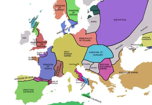 |  Europe in the late tenth century, Principality of Hungary (cyan) | |