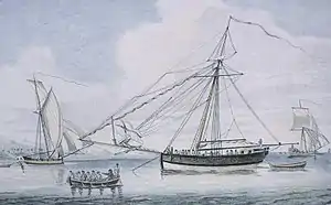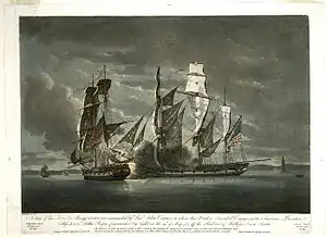 An American naval captain, ordered to take his ship out of Boston Harbor to eliminate a pair of Bermudian privateering vessels that had been picking off vessels missed by the Royal Navy, returned frustrated, saying, "the Bermudians sailed their ships two feet for every one of ours".[27] Around 10,000 Bermudians emigrated in the years prior to American independence, mostly to the American colonies. Many Bermudians occupied prominent positions in American seaports, from where they continued their maritime trades (Bermudian merchants controlled much of the trade through ports like Charleston, South Carolina, and Bermudian shipbuilders influenced the development of American vessels, like the Chesapeake Bay schooner),[23][28][29] and in the Revolution they used their knowledge of Bermudians and of Bermuda, as well as their vessels, for the rebels' cause. In the 1777 Battle of Wreck Hill, brothers Charles and Francis Morgan, members of a large Bermudian enclave that had dominated Charleston, South Carolina and its environs since settlement,[30][31] captaining two sloops (the Fair American and the Experiment, respectively), carried out the only attack on Bermuda during the war. The target was a fort that guarded a little used passage through the encompassing reef line. After the soldiers manning the fort were forced to abandon it, they spiked its guns and fled themselves before reinforcements could arrive.[32]