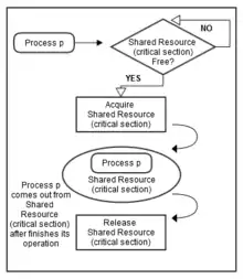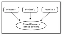 For example, suppose that there are three processes, namely 1, 2, and 3. All three of them are concurrently executing, and they need to share a common resource (critical section) as shown in Figure 1. Synchronization should be used here to avoid any conflicts for accessing this shared resource. Hence, when Process 1 and 2 both try to access that resource, it should be assigned to only one process at a time. If it is assigned to Process 1, the other process (Process 2) needs to wait until Process 1 frees that resource (as shown in Figure 2).