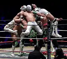 Mexican wrestlers: Gran Guerrero, Último Guerrero and Euforia performing a triple team move on their opponents. This is a characteristic in Lucha Libre, wrestlers can enter into the ring without being disqualified on time if it is a tag team match, something that in American wrestling is illegal and a cause of losing by disqualification