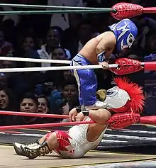 Although professional wrestling in Mexico (Lucha libre) also has stories and characters, they are less emphasized. Mexican professional wrestling tradition repeats very usually brutal tactics, specially more aerial holds than professional wrestlers in the U.S. who, more often, rely on power moves and strikes to subdue their opponents.[22] The difference in styles is due to the independent evolution of the sport in Mexico beginning in the 1930s and the fact that wrestlers in the cruiserweight division (Spanish: peso semicompleto) are often the most popular wrestlers in Mexican lucha libre. Wrestlers often execute high flying moves characteristic of lucha libre by utilizing the wrestling ring's ropes to catapult themselves towards their opponents, using intricate combinations in rapid-fire succession, and applying complex submission holds.[24] Lucha libre is also known for its tag team wrestling matches, in which the teams are often made up of three members, instead of two as is common in the U.S.[25]