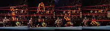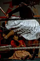 Professional wrestling also liberally incorporates melodrama. Much like some of the real prizefighters they imitate, the characters in professional wrestling have large egos, flamboyant personalities (often attached to a gimmick), and turbulent interpersonal relationships. These personas are usually scripted much like the matches. Performances mainly take place in a ring similar to the kind used in boxing.[3] In televised wrestling shows, many additional "backstage" scenes are also recorded to supplement the drama in the ring.[4]