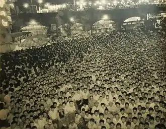 Spectators gather in Pyongyang, North Korea for Antonio Inoki's Pro Wrestling Friendship Games. A traditional wrestling ring can be seen in the lower left corner.
