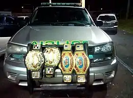 The commission's decision was announced during the company's holiday recess and Maldonado still retained physical possession of the championship belt. On January 6, 2008, Jack Meléndez, who had been managing "La Rabia", abandoned the company citing differences with the company's personnel.[82] Following Meléndez's exit from the company, La Rabia abandoned the company as well, no-showing the special event scheduled for January 6, 2008.[83] That same night, Maldonado appeared at the International Wrestling Association's Histeria Boricua event, with the championship belt still in his possession and challenged Freddie "Blitz" Lozada, the current IWA World Heavyweight Champion to a unification match.[84][85] The match took place later in the event with Lozada winning both belts.[86] Following this match WWC's merchandise manager, José Roberto Rodríguez, who had been allowed entry into the building, demanded that the belt was returned to him.[87] However, by this time, the IWA's personnel had replaced the belt with Revolution X-Treme Wrestling's championship belt (which was in Rivera's possession) and had transferred the Universal Championship to a secure location. This led to a discussion between personnel from both companies and Rodríguez's expulsion from the event.[84] After the event's conclusion, police officers were contacted but the IWA retained physical possession of the championship.[88] The IWA Photoshoped the images of the plate by adding "Capitol" over the usual location of "Universal" and by modifying its silver hub to a bronze coloration, promoting the event by playing Joy in the background of their advertisement.[89] The belt was returned to WWC personnel following an ultimatum, which claimed that the company would take legal action if it wasn't returned within forty-eight hours.[90][91]