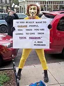 Protesters at the demonstration wore masks, and said they were attempting to inform the public about what they believed to be "restrictions of free speech and profiteering through pyramid schemes" by the Church of Scientology.[53] They asserted they were not protesting the doctrine of Scientology, but rather alleged actions of individual Scientologists.[53] One protester stated that he had created a Facebook group to organize the protest, explaining "It started online with a group called Anonymous ... They got upset with Scientology because the church hides important documents that are supposed to be released to the public."[53]