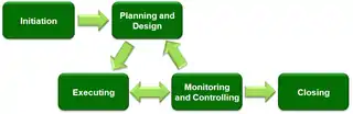 There are five phases to a project lifecycle; known as process groups. Each process group represent a series of inter-related processes to manage the work through a series of distinct steps to be completed. This type of project approach is often referred to as "traditional"[29] or "waterfall".[30] The five process groups are: