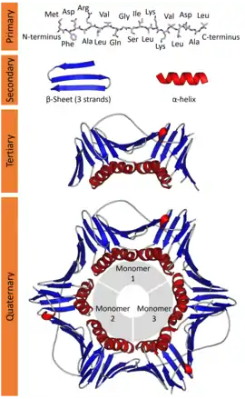 Protein structure is the three-dimensional arrangement of atoms in an amino acid-chain molecule. Proteins are polymers – specifically polypeptides – formed from sequences of amino acids, the monomers of the polymer. A single amino acid monomer may also be called a residue indicating a repeating unit of a polymer. Proteins form by amino acids undergoing condensation reactions, in which the amino acids lose one water molecule per reaction in order to attach to one another with a peptide bond. By convention, a chain under 30 amino acids is often identified as a peptide, rather than a protein.[1] To be able to perform their biological function, proteins fold into one or more specific spatial conformations driven by a number of non-covalent interactions such as hydrogen bonding, ionic interactions, Van der Waals forces, and hydrophobic packing. To understand the functions of proteins at a molecular level, it is often necessary to determine their three-dimensional structure. This is the topic of the scientific field of structural biology, which employs techniques such as X-ray crystallography, NMR spectroscopy, cryo electron microscopy (cryo-EM) and dual polarisation interferometry to determine the structure of proteins.