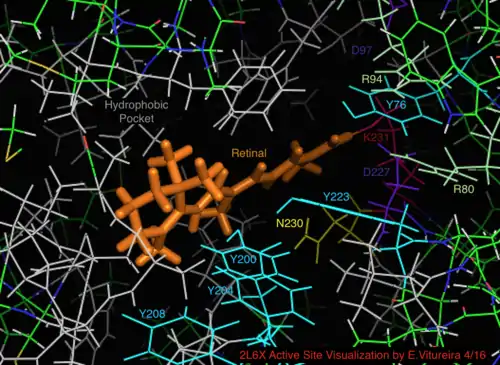 Visualization of the retinal bound active site of the 2L6X protein structure of pRhodopsin, residues color coded and labeled by activity, ligand is orange.