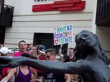 On February 4, thousands of protesters marched on Trump's Mar-a-Lago resort in Palm Beach, Florida, where Trump was attending a fundraiser for the International Red Cross.[157] In New York City, thousands from the LGBTQ community gathered at the historic Stonewall Inn in a show of solidarity with immigrant communities and those affected by Trump's travel ban.[158] Thousands of people in San Francisco participated in a peaceful protest against Trump taking place outside San Francisco City Hall.[159] Protests also took place in Los Angeles and Washington, D.C.[160] In Canada, thousands gathered outside the U.S. consulate in Toronto to protest against Islamophobia and Trump's ban.[161] Thousands of U.K. citizens also took to the streets in protest of the travel ban and Theresa May's invitation to Trump for a state visit.[162]