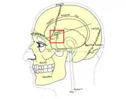 The pterion is the region where the frontal, parietal, temporal, and sphenoid bones join.[1] It is located on the side of the skull, just behind the temple.