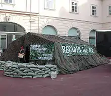The Free Media Camp aimed at raising public awareness about the extremely precarious situation of independent and participatory media initiatives in Vienna. The camp was established in public space at Vienns Karlsplatz and lasted for almost four months. In sum approximately 100 events (discussions, presentations, music events, screenings...) took place. The camp was organized by Public Netbase in co-operation with local cultural and media initiatives: Malmoe, IG Kultur Wien, Radio Orange 94.0 and Public Voice Lab.[44][45]