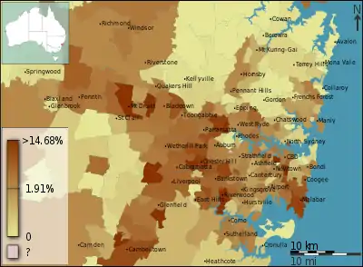 ![]() Dwellings rented from the NSW housing authority as a percentage of all dwellings in Sydney divided geographically by postal area, at the 2011 census