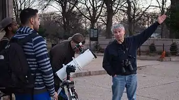 An example of a specific public science initiative in astronomy is From Earth to the Universe (FETTU),[10] a project of the International Year of Astronomy 2009 (IYA2009).[11] FETTU displayed large-scale images of astronomical objects with contextual information and supplementary materials and activities in non-traditional and mostly public locations such as parks, airports, art festivals, and shopping malls. By 2011, FETTU had been exhibited at about 1000 sites worldwide, with 50 sites in the United States.[12] One result from FETTU demonstrated a trend towards more non-self-selective audiences for science communications in these public spaces.