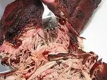In rural areas across the United States, either a pig roast/whole hog, mixed cuts of the pig/hog, or the shoulder cut (Boston butt) alone are commonly used, and the pork is then shredded before being served with or without a vinegar-based sauce.[2] Before cooking, it is common to soak the meat in brine; this process provides the extra moisture needed for a long, slow cooking process.