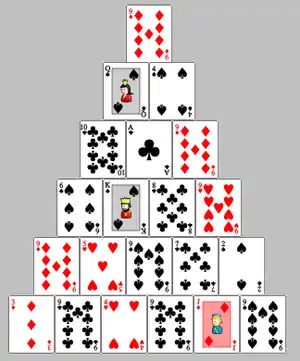 |  Cards are laid out in a pyramid shape, starting face-down and ending the game face-up | |