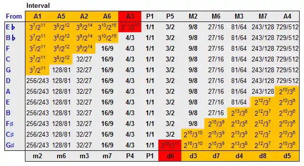 The table shows from which notes some of the above listed intervals can be played on an instrument using a repeated-octave 12-tone scale (such as a piano) tuned with D-based symmetric Pythagorean tuning. Further details about this table can be found in Size of Pythagorean intervals.