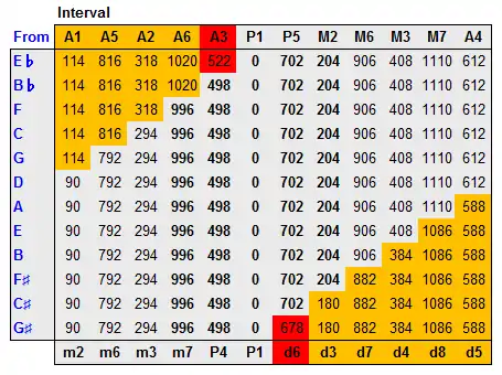 (cents)- A♭ - diminished fifth - 588.27 - −11.73 - E♭ - minor second - 90.22 - −9.78 - B♭ - minor sixth - 792.18 - −7.82 - F - minor third - 294.13 - −5.87 - C - minor seventh - 996.09 - −3.91 - G - perfect fourth - 498.04 - −1.96 - D - unison - 0.00 - 0.00 - A - perfect fifth - 701.96 - 1.96 - E - major second - 203.91 - 3.91 - B - major sixth - 905.87 - 5.87 - F♯ - major third - 407.82 - 7.82 - C♯ - major seventh - 1109.78 - 9.78 - G♯ - augmented fourth - 611.73 - 11.73
