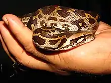 The rock python's color pattern is whitish or yellowish with the blotched patterns varying from tan to dark brown shades. This varies with terrain and habitat. Specimens from the hill forests of Western Ghats and Assam are darker, while those from the Deccan Plateau and Eastern Ghats are usually lighter.[8] All pythons are non-venomous.