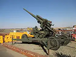 The QF 3.7-inch AA was Britain's primary heavy anti-aircraft gun during World War II. It was roughly the equivalent of the German Flak 8.8 cm and American 90 mm, but with a slightly larger calibre of 3.7 inches, approximately 94 mm. Production began in 1937 and it was used throughout World War II in all theatres except the Eastern Front. It remained in use after the war until AA guns were replaced by guided missiles beginning in 1957.