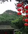 The park is referred to as 'The Northeast Pearl'. The name Qianshan literally means 'Thousand mountains'. This is actually an abbreviation of the full name, Thousand Lotus Flower Mountains (Chinese: 千朵莲花山; pinyin: qiān duǒ liánhuā shān).[2] According to legend, a long time ago the four corners of the sky collapsed. The Goddess Nüwa wanted to save the people living below so she patched up the sky with stones. One stone was accidentally dropped to the ground where is splashed, throwing the earth into thousands of peaks in the shape of a lotus blossom. Thus Nüwa created Qianshan.[3] The park area of 44 square kilometres,[4] is filled with both Buddhist and Taoist temples, monasteries and nunneries. Here is one of few locations where both religions are found sharing the same site. Among the peaks, a naturally wrought statue of the Buddha stands 70 meters high. It is claimed to be largest naturally occurring image of Maitreya Buddha in the world.