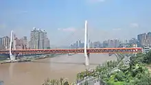 The Qianximen Bridge (sometimes Qiansimen Bridge) crosses the Jialing River with a cable-stayed main span that is 312 metres (1,024 feet), connecting the Jiangbei and the Yuzhong Districts. The placement of the single tower means that the cable-stayed back span of 240 metres (787 feet) provides a secondary channel for shipping. The bridge has a total length of 720 metres (2,362 feet) as it includes girder spans of 88 metres (289 feet) and 80 metres (262 feet). The bridge has nine pairs of cables. The Qianximen Bridge has the longest stay cable of both bridges, measuring 256.85 metres (843 feet) long.[1] The bridge was shortlisted for an award by the Institution of Structural Engineers.[3]
