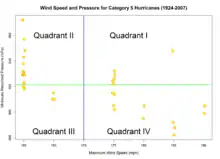 The scatterplot shows the maximum wind speed (X) and minimum pressure (Y) for 35 Category 5 Hurricanes. The mean wind speed is 170 mph (indicated by the blue line), and the mean pressure is 921.31 hPa (indicated by the green line). There are 6 observations in Quadrant I, 13 observations in Quadrant II, 5 observations in Quadrant III, and 11 observations in Quadrant IV. Thus, the QCR for these data is , indicating a moderate negative relationship between wind speed and pressure for these hurricanes. The value of Pearson's correlation coefficient for these data is −0.63, also indicating a moderate negative relationship..