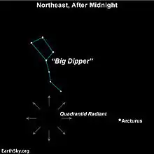 The Quadrantids (QUA) are a meteor shower that peaks in early January and whose radiant lies in the constellation Boötes. The zenithal hourly rate (ZHR) of this shower can be as high as that of two other reliably rich meteor showers, the Perseids in August and the Geminids in December,[4] yet Quadrantid meteors are not seen as often as those of the two other showers because the time frame of the peak is exceedingly narrow, sometimes lasting only hours. Moreover, the meteors are quite faint, with mean apparent magnitudes between 3.0 and 6.0).