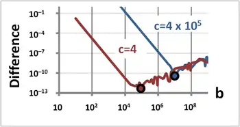 These formulas are much easier to evaluate than the quadratic formula under the condition of one large and one small root, because the quadratic formula evaluates the small root as the difference of two very nearly equal numbers (the case of large b), which causes round-off error in a numerical evaluation. The figure shows the difference between (i) a direct evaluation using the quadratic formula (accurate when the roots are near each other in value) and (ii) an evaluation based upon the above approximation of Vieta's formulas (accurate when the roots are widely spaced). As the linear coefficient b increases, initially the quadratic formula is accurate, and the approximate formula improves in accuracy, leading to a smaller difference between the methods as b increases. However, at some point the quadratic formula begins to lose accuracy because of round off error, while the approximate method continues to improve. Consequently, the difference between the methods begins to increase as the quadratic formula becomes worse and worse.