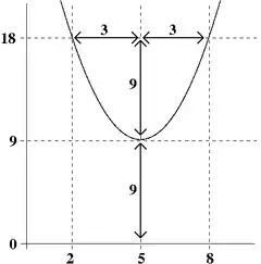 Let d be the distance between the point of y-coordinate 2k on the axis of the parabola, and a point on the parabola with the same y-coordinate (see the figure; there are two such points, which give the same distance, because of the symmetry of the parabola). Then the real part of the roots is h, and their imaginary part are ±d. That is, the roots are