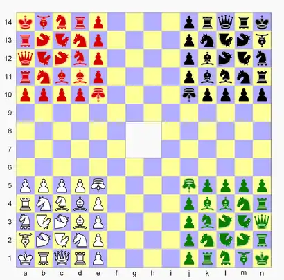 Quatrochess is a chess variant for four players invented by George R. Dekle Sr. in 1986.[1][2] It is played on a square 14×14 board that excludes the four central squares. Each player controls a standard set of sixteen chess pieces, and additionally nine fairy pieces. The game can be played in partnership (two opposing teams of two) or all-versus-all.