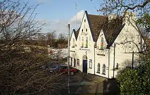 Until the opening of Swale Halt in 1922, Queenborough was the only intermediate station on the Sheerness Line.[14][15] The imposing two-storey station building has a strong Victorian character with their high-pitched gables and round-headed sash windows.[14] The building is in a similar style to Lymington Town railway station which dates from the same period, a resemblance which may be explained by the fact that the construction of both the Lymington Branch Line and the S&SR was overseen by John Cass Birkinshaw who was replaced as engineer on the S&SR after the company's directors blamed him for the line's slow construction.[16]