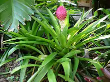 It can be found growing on trees in virgin forests near Serra do Mar. It has a well-formed rosette of about 20 plain green leaves. These leaves have lightly serrated edges and are tipped by a sharp spine. The bloom reaches about a foot high. The inflorescence bears rosy red bracts and violet or white petals.[1] It is a semi-cold hardy bromeliad that can tolerate temperatures down to 25 °F for a few hours.