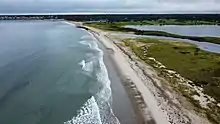 Goosewing Beach is a 1.4 kilometres (0.87 mi) long cobbly barrier beach[2] at the southern end of Quicksand Pond.[9] Its dunes are dominated by beachgrass and seaside goldenrod.[8]
