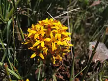 Quinchamalium chilense is a herbaceous, hemiparasitic, perennial plant with a rhizome, from which smaller rootlets with haustoria grow. From the rhizome a number of rarely-branching stems grow each year. These can be decumbent (creeping over the ground) or rise to over 2 metres in height. The flowers are produced in a cluster at the end of the stems, they are pentamerous and usually orangey-yellow in colour. It is extremely variable in height and flower size and colour, so much so that at one time 21 species were recognised, but in 2015 these were all reduced to synonymy with Q. chilense.[5][3] It is heterostylous;[5] some individuals bear 'thrum flowers', flowers which have short styles. This is somewhat correlated with altitude and cold. The leaves are also variable among individuals, they can be narrow or broader, the plants with more narrow leaves correlated with higher temperatures. The size of the plant appears correlated with annual precipitation.[4]