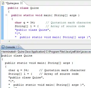 - "Simple Java quine, self replicating (Self copying) Java code, with text blocks. This code can be run with Java 15+ or Java 13+ with special flags. License is public domain, no rights reserved".