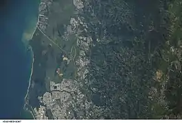 The Rio Grande de Loíza basin is the largest in Puerto Rico with an area of 289.9 square miles.[2] The source of the river is located in the Espino barrio of San Lorenzo, Puerto Rico on the eastern slopes of the Sierra de Cayey mountain range, close to Carite State Forest. The river flows northeastwardly through the San Lorenzo batholith, a hilly region of intrusive igneous rock, where it meets with the tributaries of Emajagua and Cayaguas. From here, the river turns northwest towards the Caguas Valley where it meets numerous other rivers and creeks including the Turabo, Gurabo, Bairoa and Cagüitas rivers. North of this, the river is dammed and flows through the reservoir Loíza Lake (also known as Carraízo Lake, after the barrio of Trujillo Alto it is located in). The river finally flows into San Juan's urban area and the Northern Plain of Puerto Rico where it discharges into the Atlantic Ocean.[2]