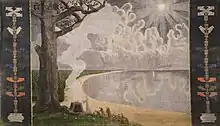 The theater group with Mykolas Sleževičius was particularly active.[2] It also included Gabrielius Landsbergis-Žemkalnis, Antanas Žmuidzinavičius, and others.[2] The backdrop was painted by Mikalojus Konstantinas Čiurlionis in June 1909. It has survived and is preserved at the M. K. Čiurlionis National Art Museum[9] and commemorated by a fresco inside the former theater of Rūta.[10] The group, which was active even before Rūta was officially organized, staged several plays, most notably historical dramas Mindaugis, Lietuvos karalius by Juliusz Słowacki (Mindaugas, King of Lithuania; premiered on 27 April 1908) and Živilė, duktė Karijoto by Vincas Nagornoskis (Živilė, Daughter of Karijotas; premiered on 4 January 1909).[2] The plays had to be approved by Russian censors who diligently removed any anti-Russian sentiments.[11] As a result, many plays were significantly cut. For example, Živilė, duktė Karijoto lost the entire first section and many scenes.[11]