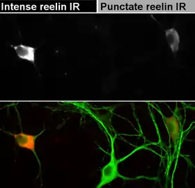 Having peaked just after the birth, the synthesis of reelin subsequently goes down sharply, becoming more diffuse compared with the distinctly laminar expression in the developing brain. In the adult brain, reelin is expressed by GABA-ergic interneurons of the cortex and glutamatergic cerebellar neurons,[32] the glutamatergic stellate cells and fan cells in the superficial entorhinal cortex that are supposed to carry a role in encoding new episodic memories, [33] and by the few extant Cajal-Retzius cells. Among GABAergic interneurons, reelin seems to be detected predominantly in those expressing calretinin and calbindin, like bitufted, horizontal, and Martinotti cells, but not parvalbumin-expressing cells, like chandelier or basket neurons.[34][35] In the white matter, a minute proportion of interstitial neurons has also been found to stain positive for reelin expression.[36]