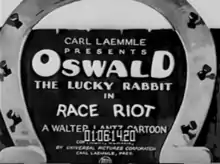 Race Riot is a 1929 animated short film which is presented by Carl Laemmle and was produced by Walter Lantz.[1] who would go on to produce and create the cartoon character Woody Woodpecker with his wife,[2] Gracie Lantz.[3] The film, which both its story and animation was composed by Walter Lantz, 'Bill' Nolan and Tom Palmer,[1] features Oswald the Lucky Rabbit,[1] as he attempts to win a horse race with his horse.[1] The horse's coughs were done by Walter Lantz.