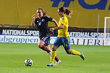 As of January 2015, Corsie has earned over 70 caps for the senior national team and has scored 13 goals playing primarily in the central defender position.[25] She scored three goals during the 2011 FIFA Women's World Cup qualification. In March 2011, Corsie captained the team to a 2–0 win over England at the 2011 Cyprus Cup, a first for Scotland in more than 30 years.[26]