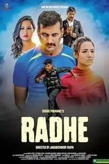 Radhe is a 2017 Nepalese romantic action social thriller film, written and directed by Jagadishwor Thapa, and produced by Sushil Pokhrel. The film stars Nikhil Upreti, Priyanka Karki, Ashishma Nakarmi and Salon Basnet in the title roles, along with Pramod Agrahari and Shishir Bhandari. The film is about a man named Radhe who loves Priya but one day he leaves the village without anyone's notice than he joins the Nepalese army to fight for his country. The film was one of the successful film that was released that year and was successful at the box office, it was estimated the film earned 3 cores in two days.[1][2][3][4][5]